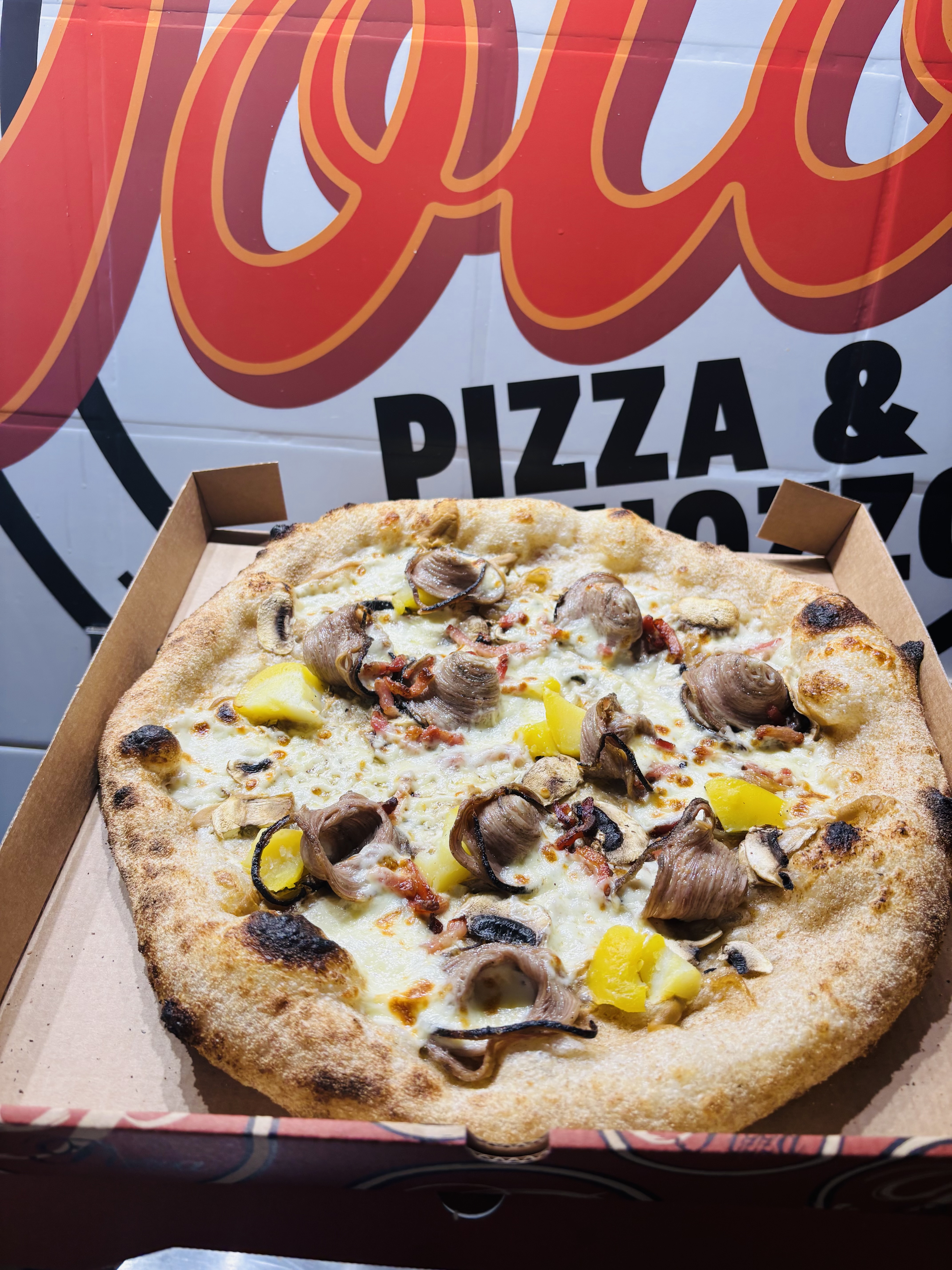 La Sissi: Base crème de burrata, champignons, jambon fumé « speck », olives italiennes, huile d’olive au basilic frais