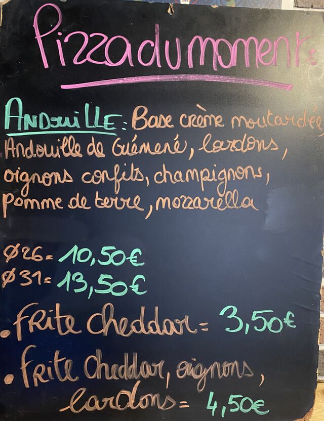 L’Andouille: Base crème moutarde à l’ancienne, andouille de Gueméné, pomme de terre, oignons confits